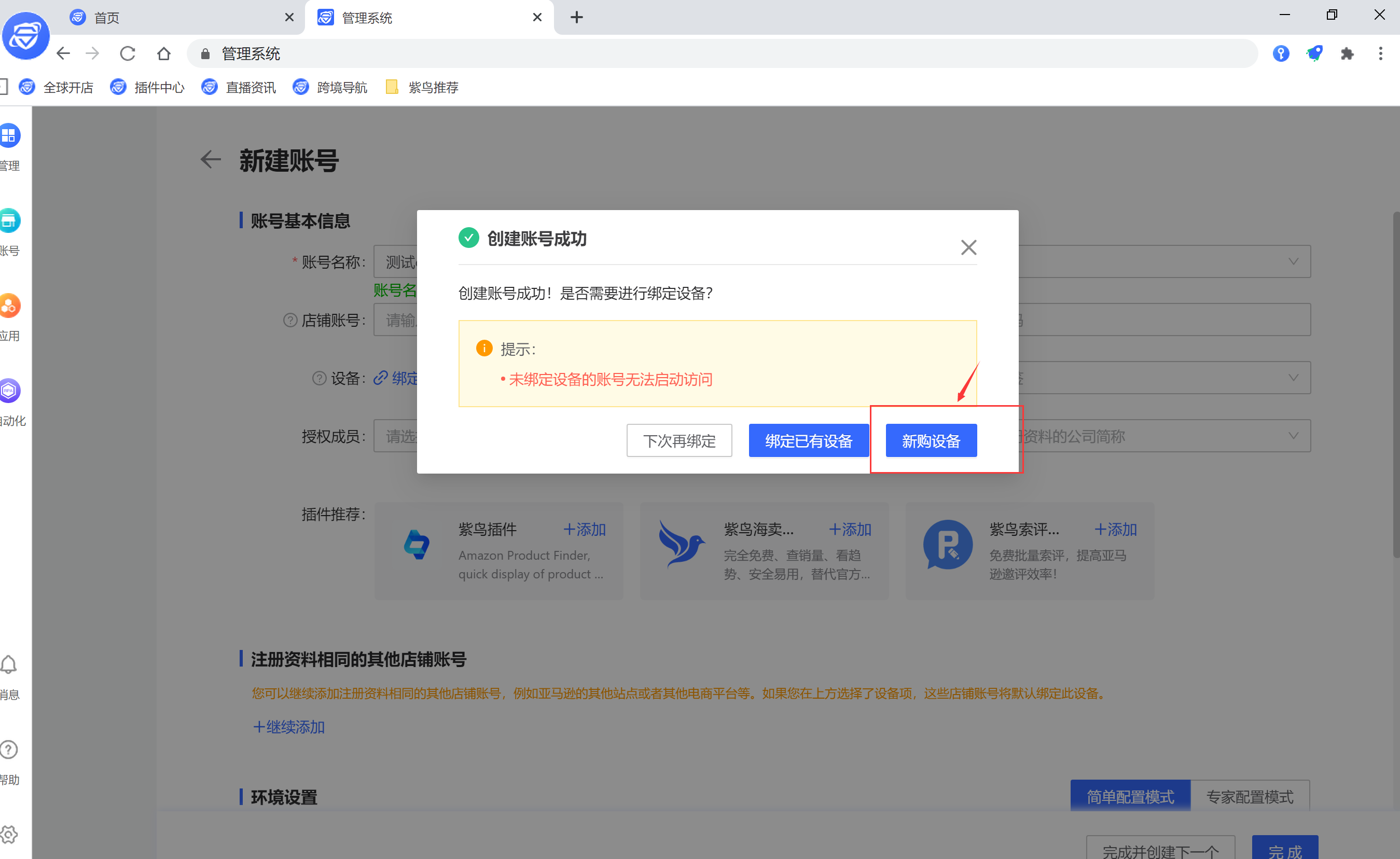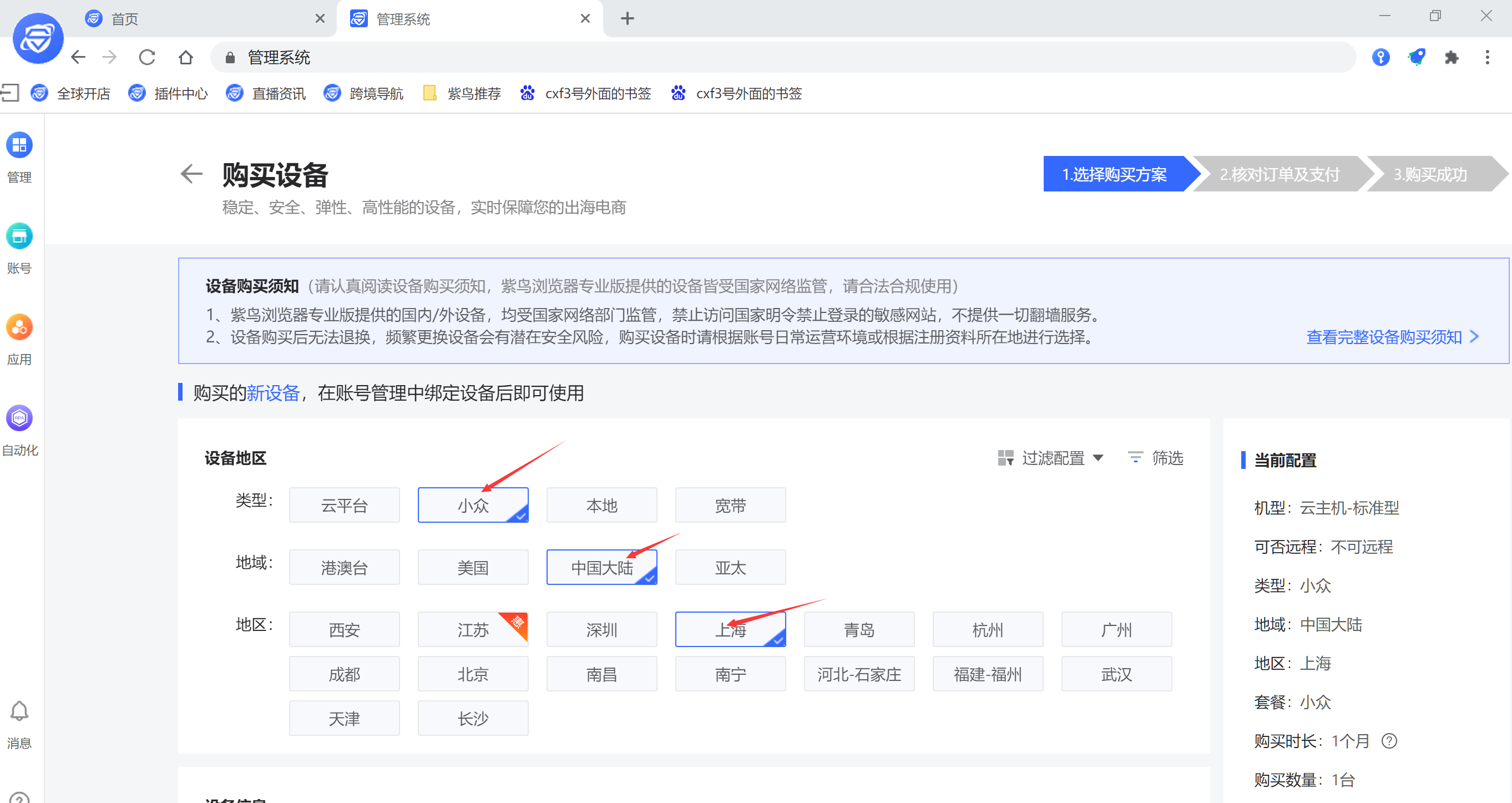 3.点击【新购设备】,进入设备购买页面,购买小众或宽带设备,比如注册亚马逊平台,设备地域和地区选择跟注册店铺的公司所在地一致。由于各平台政策存在差异,请根据平台政策谨慎选择合适的套餐,购买前请认真阅读【设备购买须知】以及套餐下发的套餐说明
