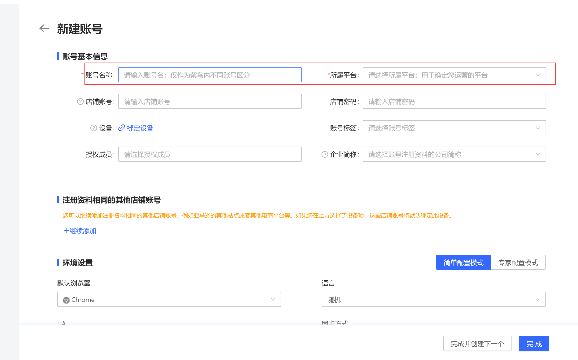 1.创建一个账号,创建账号的时候店铺账号和店铺密码不需要填写,所属平台选择要注册的店铺平台即可
