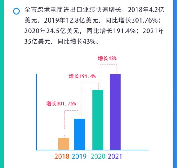 目前,长沙市跨境电商进出口业绩已得到快速增长,数据显示,2018年4.2亿美元,2019年12.8亿美元,同比增长301.76%;2020年24.5亿美元,同比增长191.4%;2021年35亿美元,同比增长43%。