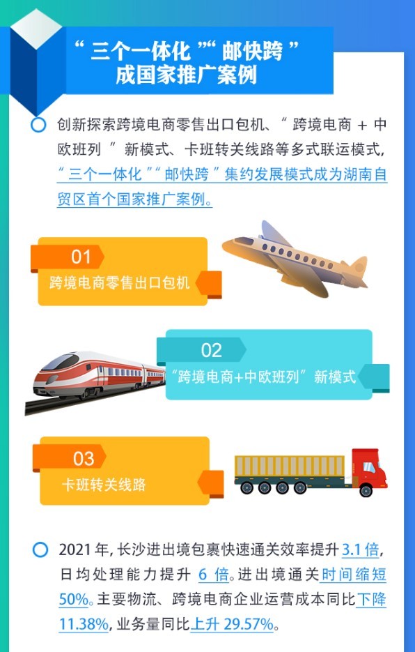 与此同时,长沙市创新探索跨境电商零售出口包机”跨境电商+中欧班列“新模式、卡班转关线路等多式联运模式。“三个一体化”、“邮快跨”集约发展模式也已成为湖南自贸区首个国家推广案例。