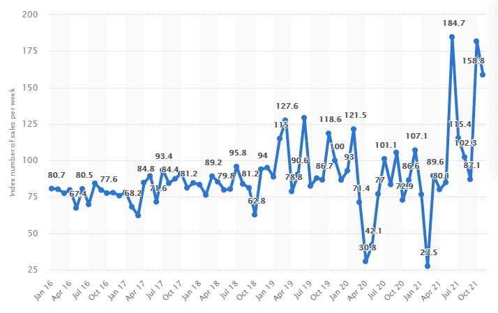 此外,过去三年内,英国二手商品销售额稳步增长,到2021年11月达到158.8的指数水平。2021年,英国二手产品销售额同比增长27.2%。