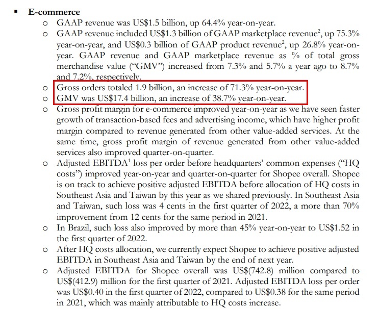 值得一提的是,根据Shopee母公司Sea冬海集团公布的2022年一季度财报,Shopee 2022年第一季度的GMV为174亿美元,同比增长了38.7%;GAAP收入为15亿美元,同比增长了64.4%;总订单数为19亿,同比增长了71.3%。