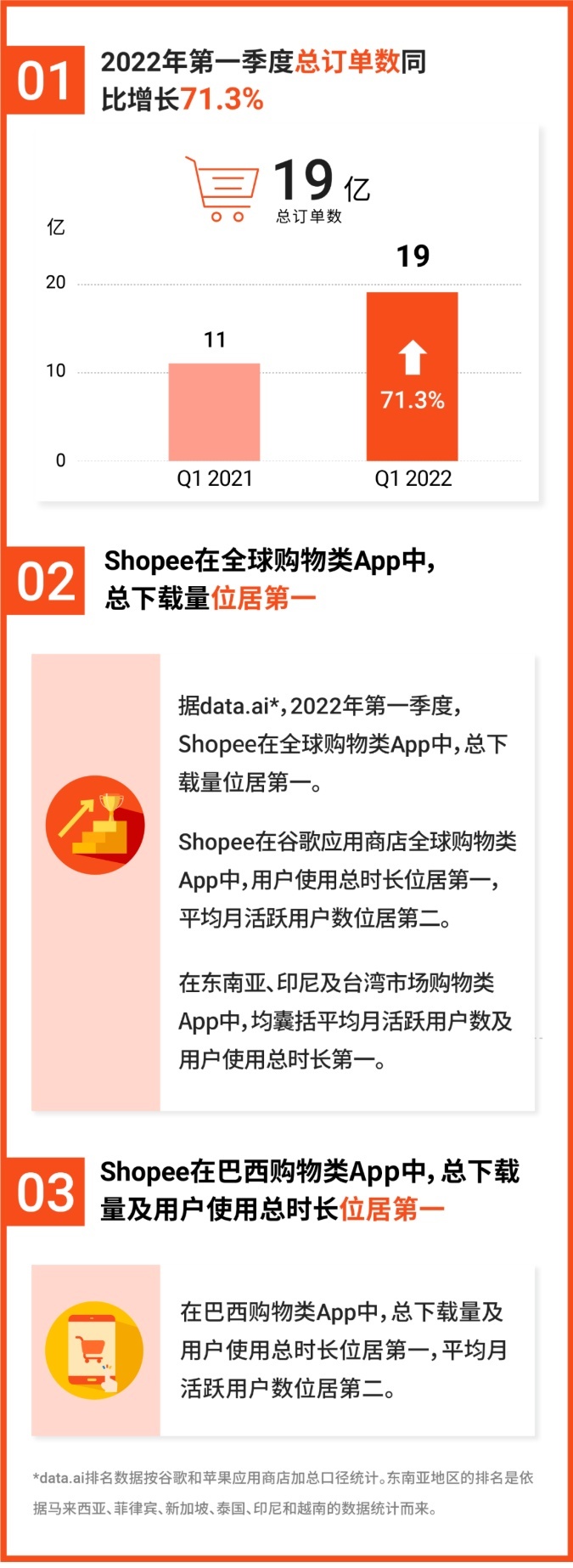 另据data.ai数据,2022年第一季度,Shopee在全球购物类App中,总下载量位居第一。