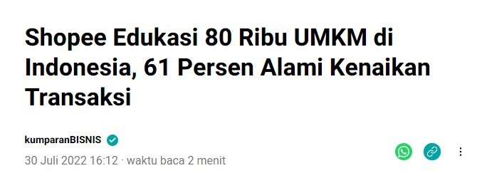 近日,Shopee Indonesia公共政策负责人Radityo Triatmojo在2022 Master Class 2 batch 2 business coil计划中透露,截至目前,Shopee已为8万印尼中小微企业(MSME)提供培训,其中,61%的人的交易量有所增加。