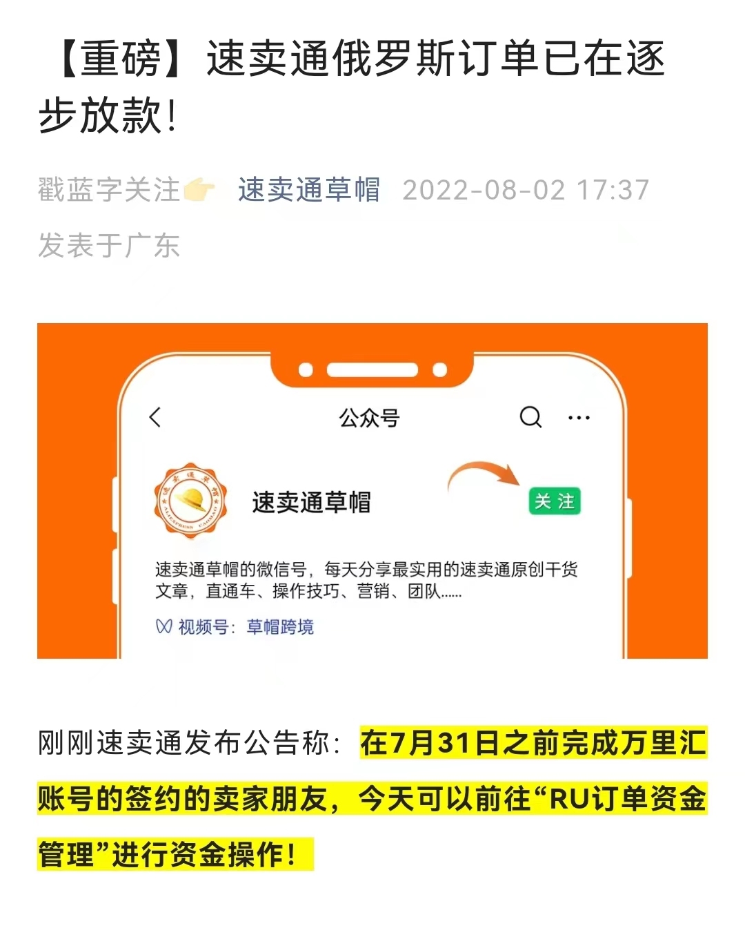 今日,速卖通发布公告称,俄罗斯订单正在逐步放款,在7月31日之前完成万里汇账号的签约的卖家,今天可以前往“RU订单资金管理”进行资金操作。