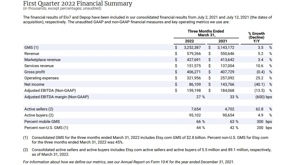 2022年第一季度,Etsy合并收入为5.793亿美元,与2021年第一季度相比增长5.2%;净收入为8610万美元,同比下降40.1%;每股摊薄收益为0.60美元。净收入下降主要是由于员工薪酬相关费用增加,因为员工总数同比增长约71%,其中包括因收购Depop和Elo7而增加的员工人数。