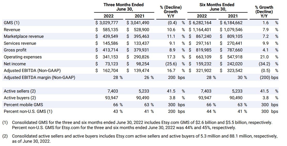 近日,Etsy公布了截至2022年6月30日的第二季度财报业绩,财报显示,Etsy今年第二季度商品销售总额(GMS)为30亿美元,同比下降0.4%。