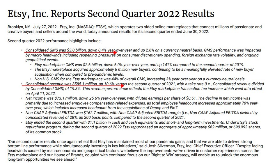 Etsy表示,第二季度GMV下降是由于宏观不利因素影响,例如重新开业、消费者可支配支出的减少、外汇汇率波动和持续的地缘政治事件。