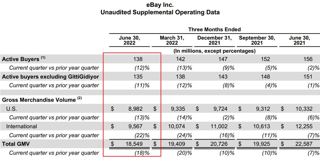 eBay第二季度总商品交易额(GMV)为185亿美元,与去年同期的226亿美元相比下降18%,不计入汇率变动的影响为同比下降14%。eBay第二季度拥有1.38亿活跃买家,同比下降12%。