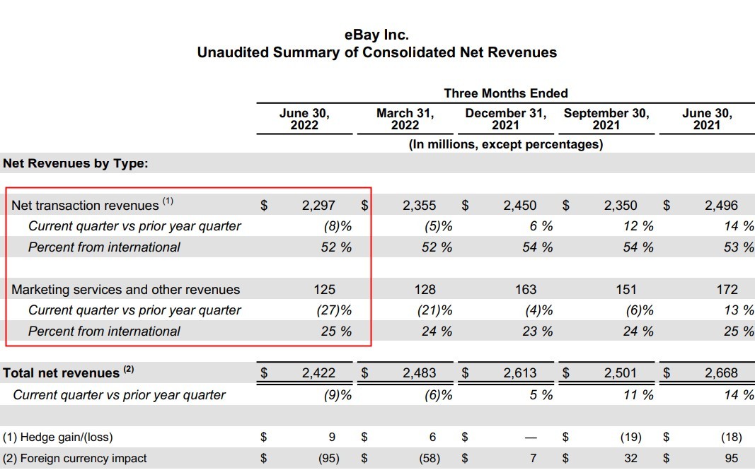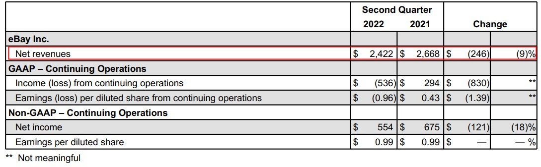 日前,eBay公布了2022年第二季度的财报业绩。财报显示,2021年第二季度eBay净营收为24.22亿美元,与去年同期的26.68亿美元相比降低9%,超出市场预期的23.7亿美元。