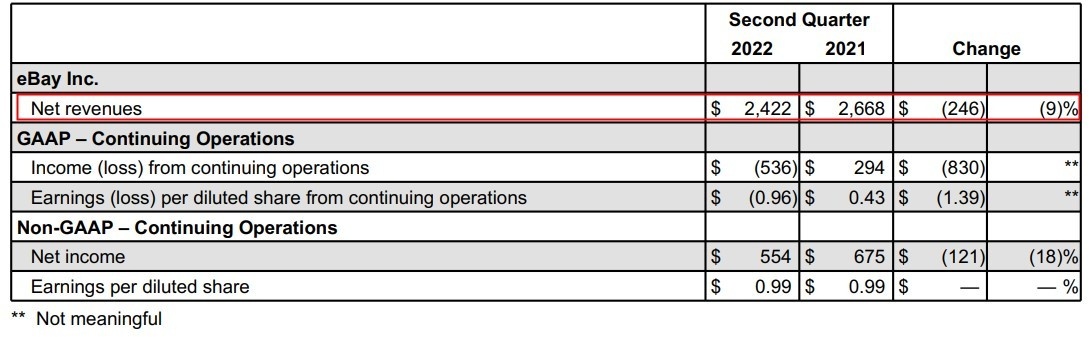 值得一提的是,近日,eBay公布了2022年第二季度的财报业绩。财报显示,2021年第二季度eBay净营收为24.22亿美元,与去年同期的26.68亿美元相比降低9%,超出市场预期的23.7亿美元。