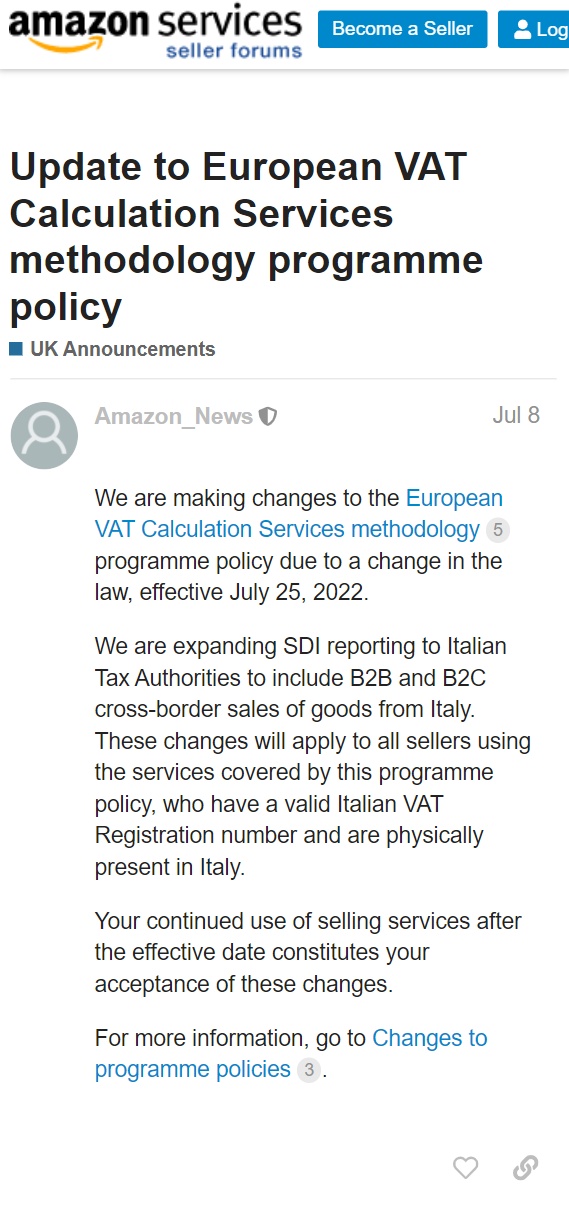 值得一提的是,此前,亚马逊欧洲站还更新了欧洲增值税计算服务方法计划政策,新政策已于2022年7月25日起生效。