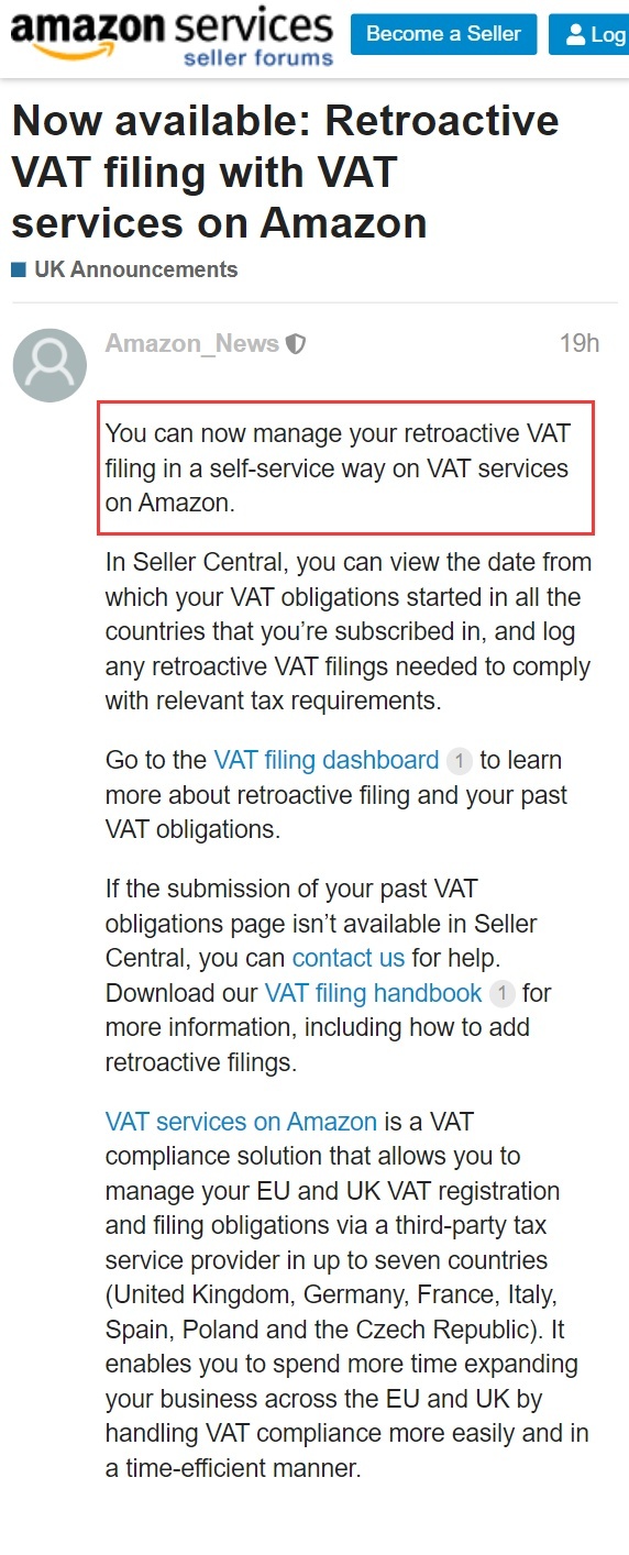 值得一提的是,7月底,亚马逊欧洲站发布公告称,卖家现在可以在亚马逊增值税服务上以自助方式管理追溯增值税申报。