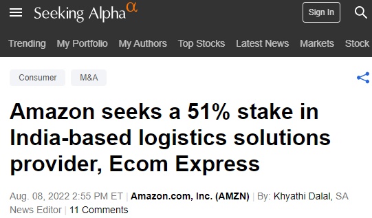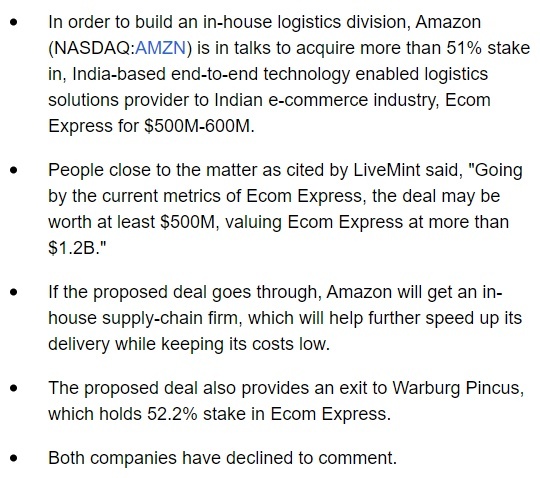 如果拟议中的交易获得通过,亚马逊将获得一家内部供应链公司,这将有助于进一步加快交付速度,同时保持低成本。拟议的交易还为持有Ecom Express 52.2%股份的Warburg Pincus提供了退出途径。