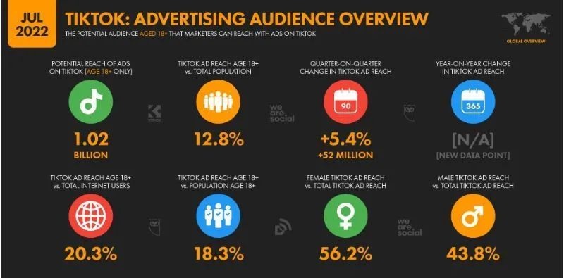 值得一提的是,根据字节跳动广告资源中公布的最新数据显示,TikTok广告现在覆盖了超过10亿18岁及以上的人群。这意味着TikTok广告现在每月覆盖国外所有成年人的22.9%。
