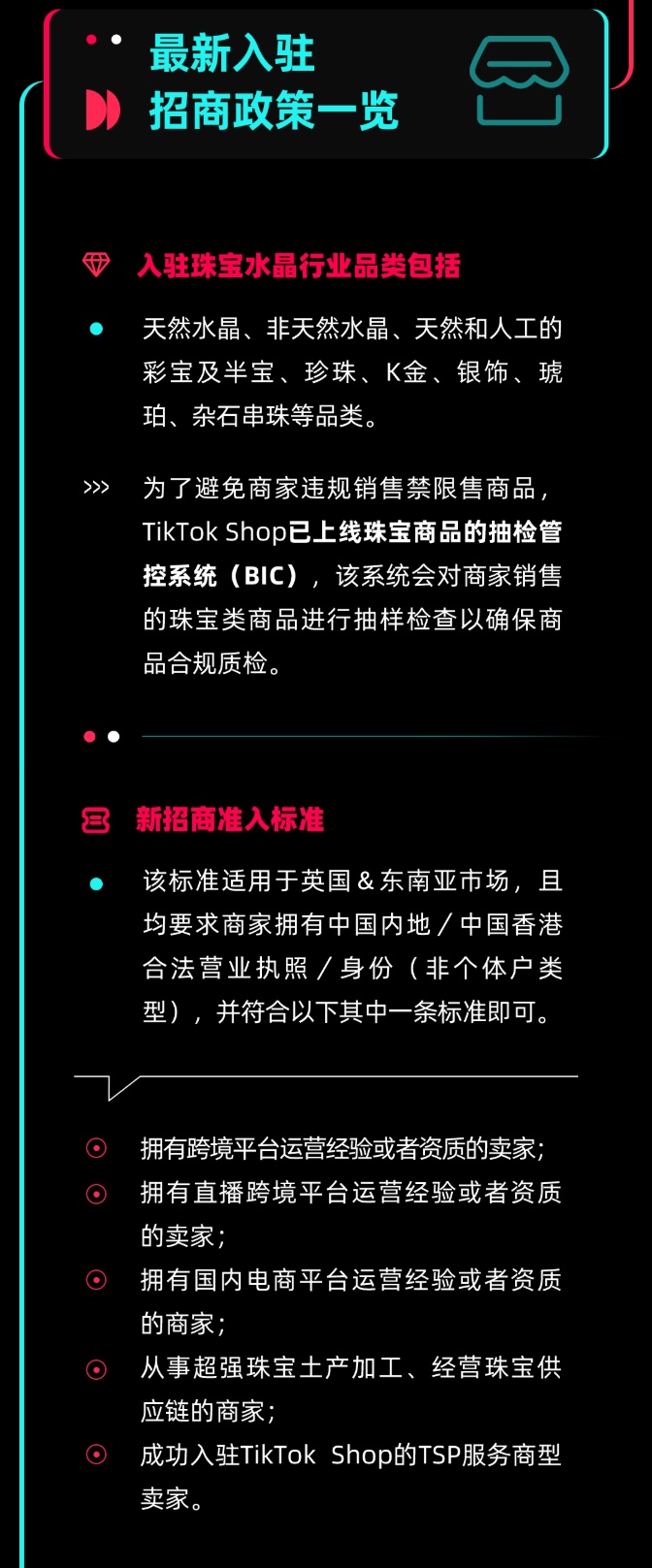 近日,TikTok Shop发布最新珠宝水晶行业招商细则,首次降低了TikTok电商珠宝水晶类目招商标准,相比起原来只能AM定邀1v1入驻,TikTok电商珠宝水晶类目门槛大大放宽。