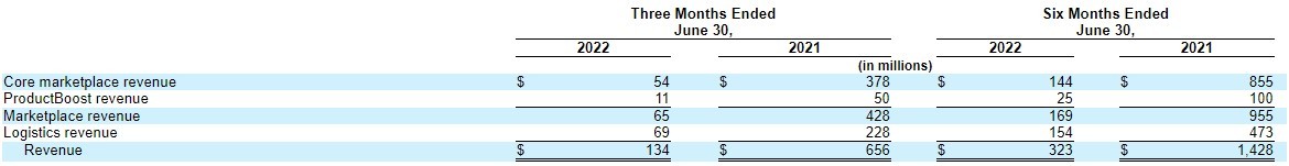 财报显示,Wish第二季度营收为1.34亿美元;核心平台市场营收为5400万美元;Product Boost营收为1100万美元;物流营收为6900万美元。