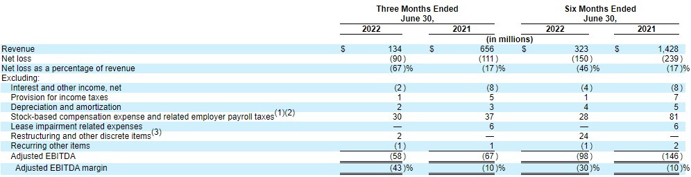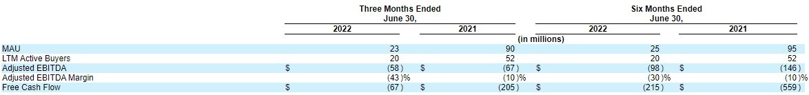 同时,Wish在今年第二季度调整后EBITDA为亏损5800万美元,亏损同比缩窄13%,占总收入的43%;净亏损9000万美元,占总收入的67%,亏损同比缩窄19%——其中每股净亏损0.13美元,与2021年同期的每股净亏损0.18美元较为改观。