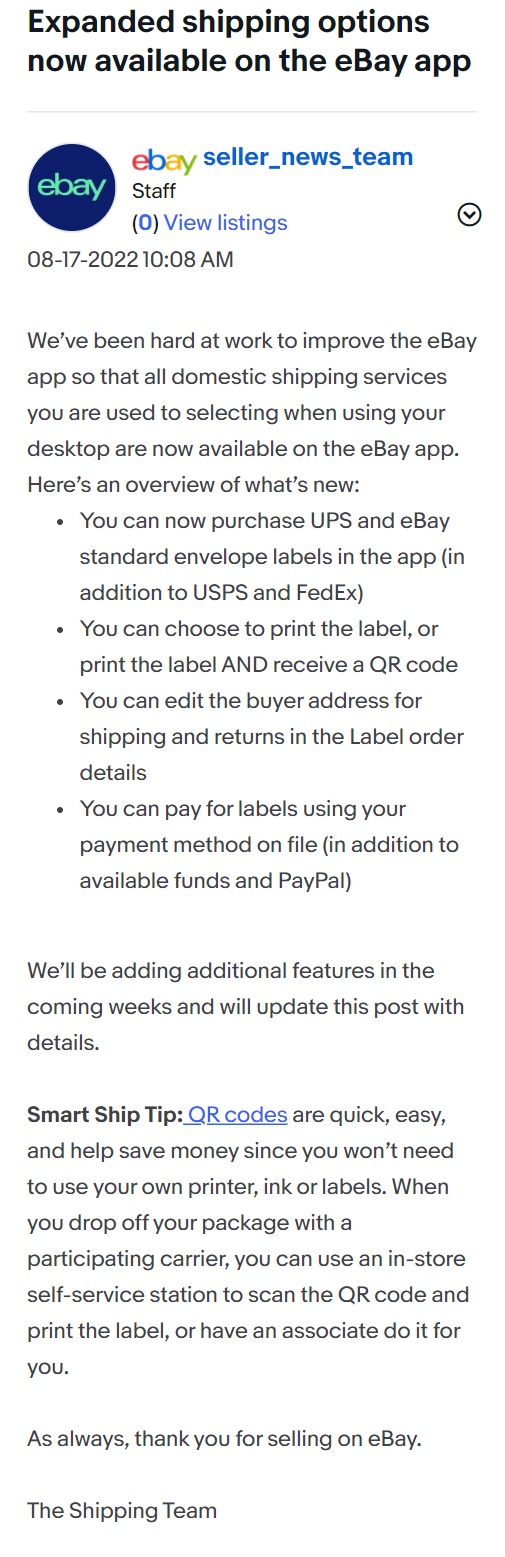据介绍,eBay推出的运输新功能如下:卖家现在可以在应用程序中购买UPS和eBay标准信封标签(除了USPS和FedEx之外);卖家可以选择打印标签,或打印标签并接收QR码;卖家可以在标签订单详情中编辑买方地址,以方便运输和退货;卖家现在可以使用存档的付款方式支付标签费用(除了可用资金和PayPal)。