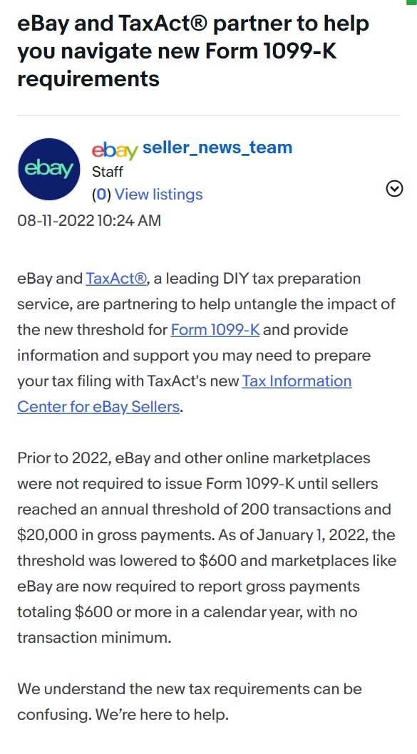 值得一提的是,近日,eBay美国站发布公告称,eBay与报税服务公司TaxAct合作推出了eBay卖家税务信息中心,以帮助卖家了解1099-K表格纳税义务,并提供相应的信息和支持。