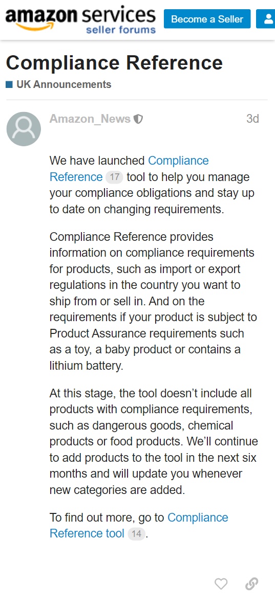 近日,亚马逊欧洲站和日本站发布公告称,推出了合规参考工具帮助卖家管理合规义务并及时了解不断变化的合规要求。