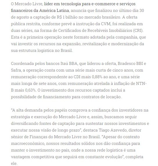 拉丁美洲电子商务和金融服务技术提供商Mercado Libre宣布,8月30日,完成了在巴西市场的10亿雷亚尔融资。根据CVM指令的规定,限制性公开发行分两个系列进行,以房地产应收账款证书 (CRI) 的形式进行。这是该公司采用这种形式的第一个业务,将在巴西的物流结构的扩展、振兴和现代化方面投入资源。