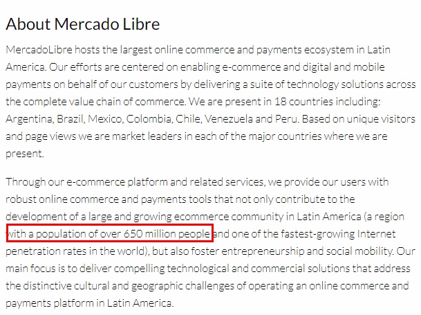 通过其电子商务平台和相关服务,Mercado Libre为用户提供在线商务和支付工具,主要重点是提供技术和商业解决方案,以解决在拉丁美洲运营在线商务和支付平台所面临的独特文化和地理挑战。