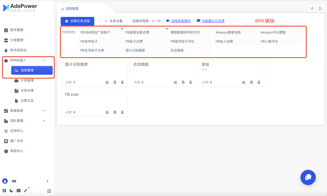 运营者可根据实际的日常操作需求,在AdsPower内勾选批量Facebook账号,开启所需的RPA模版,程序将会按照模版设置的行为对这批账号进行拟人操作,大大提高批量养号的效率。