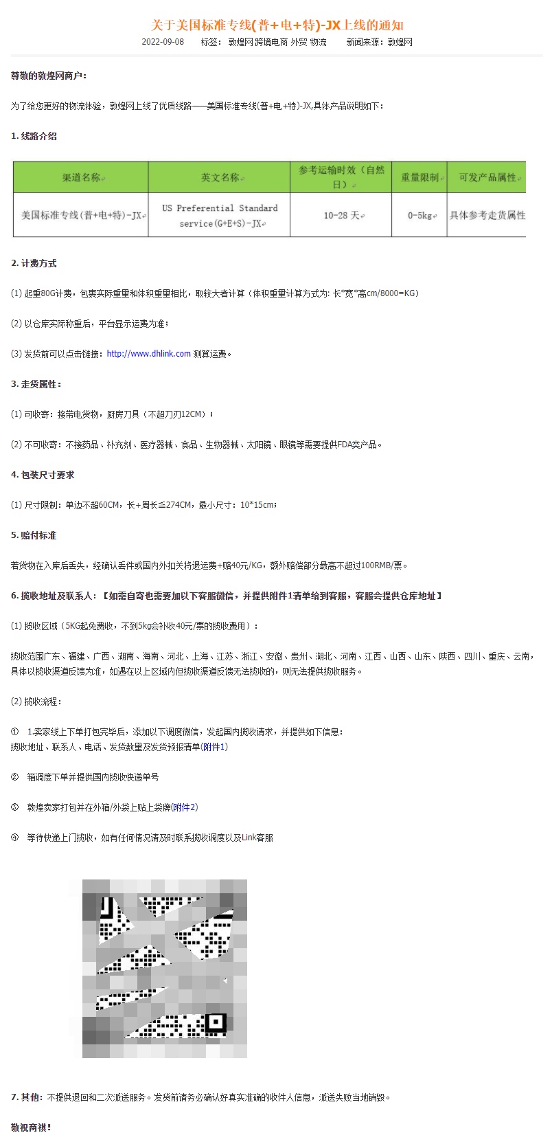 敦煌网发布关于美国标准专线(普+电+特)-JX上线的通知(以下简称“公告”)。