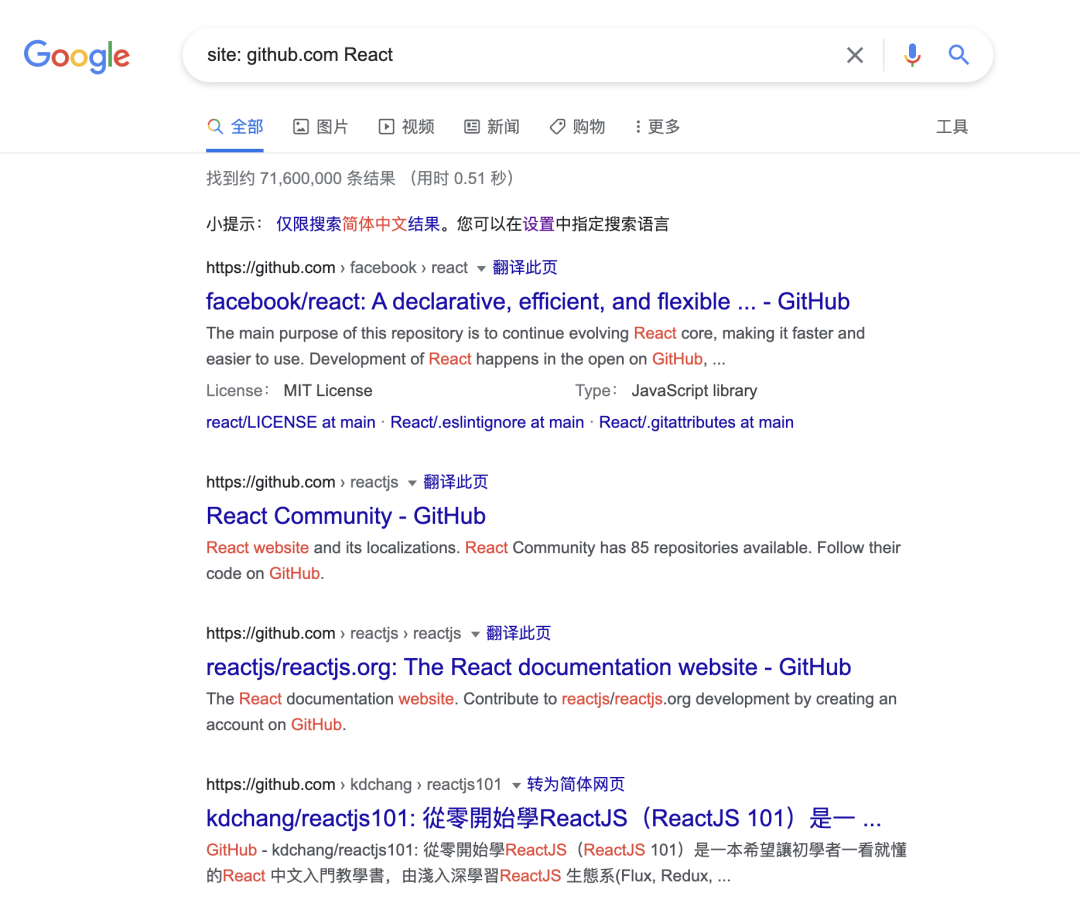 可以使用 search:网站域名 搜索内容 的形式来在指定网站内搜索内容。
