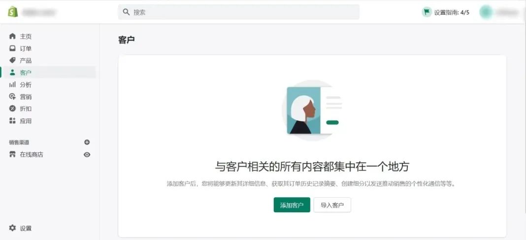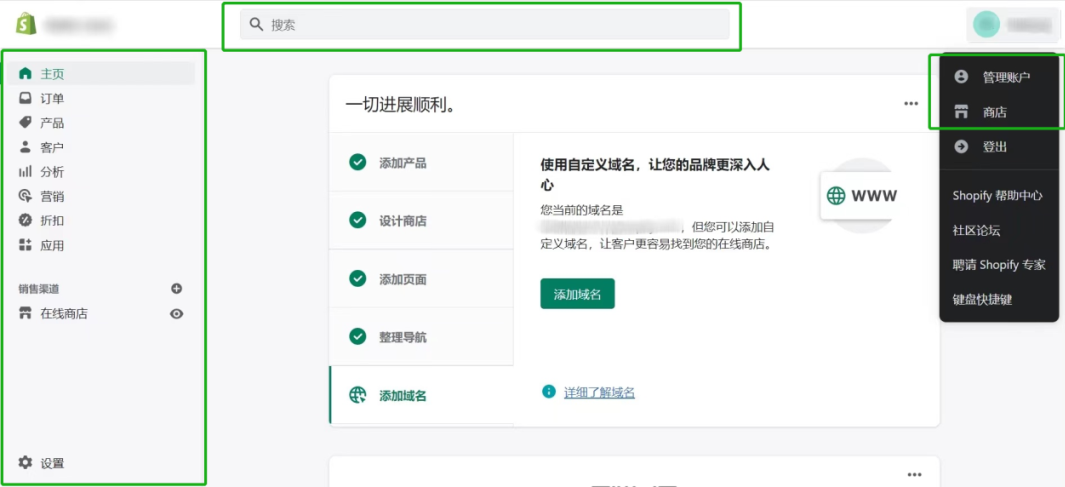 登录后台,除了首先引入眼帘的后台主页之外,您还可以使用后台左侧的侧边栏访问 Shopify 后台的不同部分,以便更进一步详细查询不同的栏目情况,对独立站运营情况有更准确的判断和高效的管理。