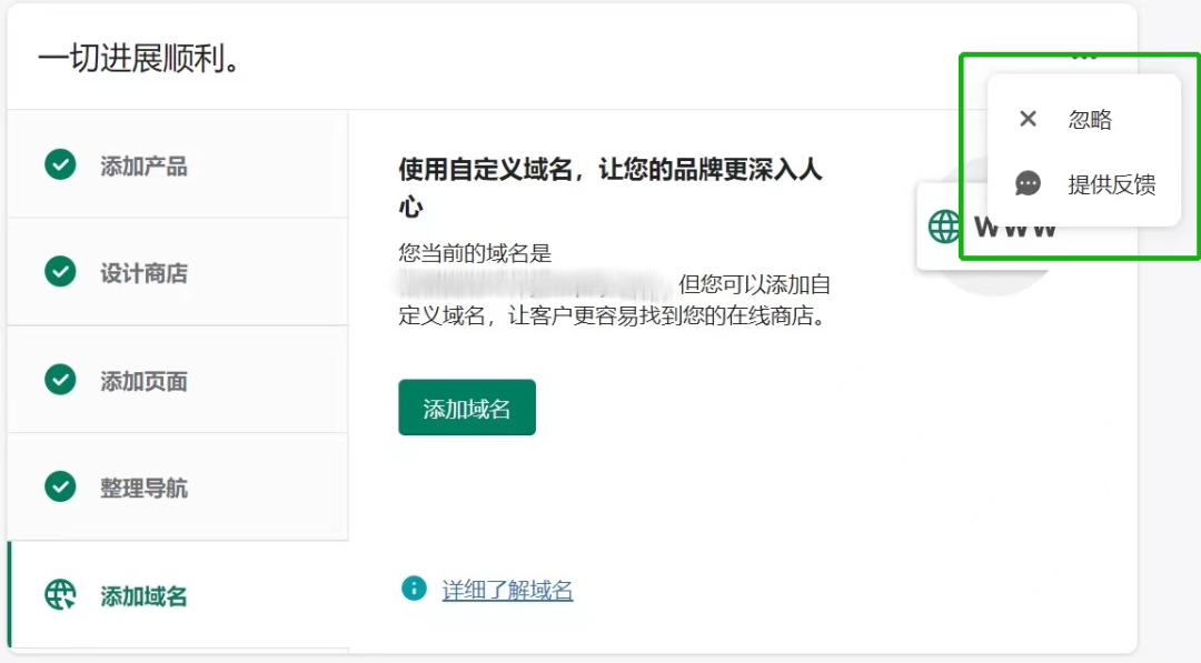 您可以点击忽略以隐藏卡片,或点击发送反馈以留下有关卡片的反馈,Shopify 将使用此信息来改进将来的主页。