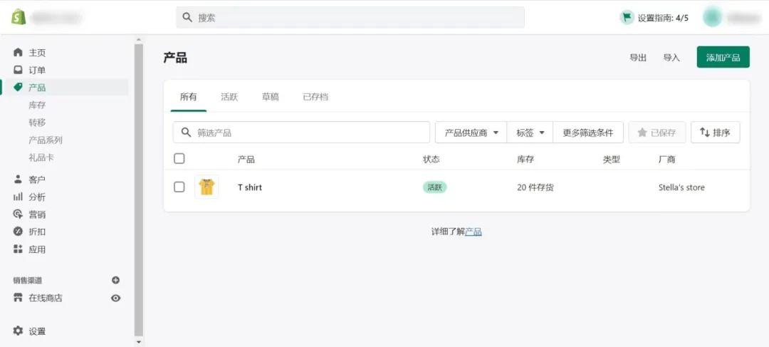 您可以使用侧边栏访问 Shopify 后台的不同部分,使用搜索栏查找 Shopify 后台内的产品、页面或其他信息。如果您在多个 Shopify 商店中有账户,则可以使用下拉菜单导航到这些商店。