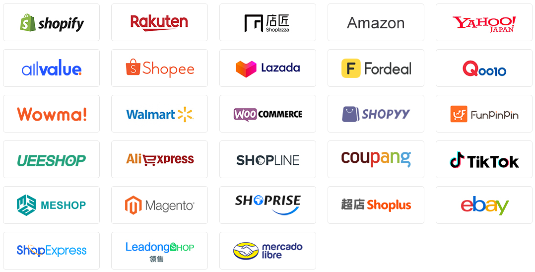 亚马逊Amazon、日本乐天Rakuten、日本雅虎Yahoo、趣天Qoo10、wowma、Shopify、Woocommerce、TikTok、shopyy、店匠shoplazza、ueeshop、有赞Allvallue、Fordeal、FunPinpin、shopee、AliExpress、wish等三十多个平台和独立站。