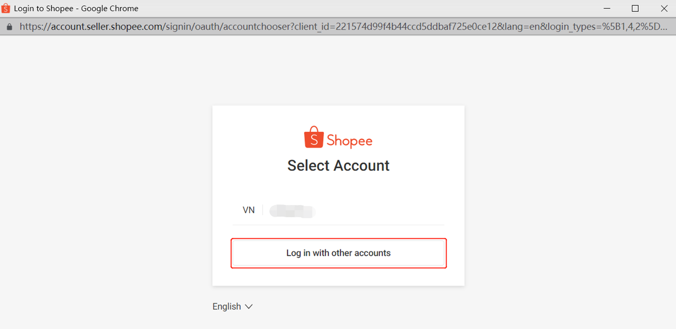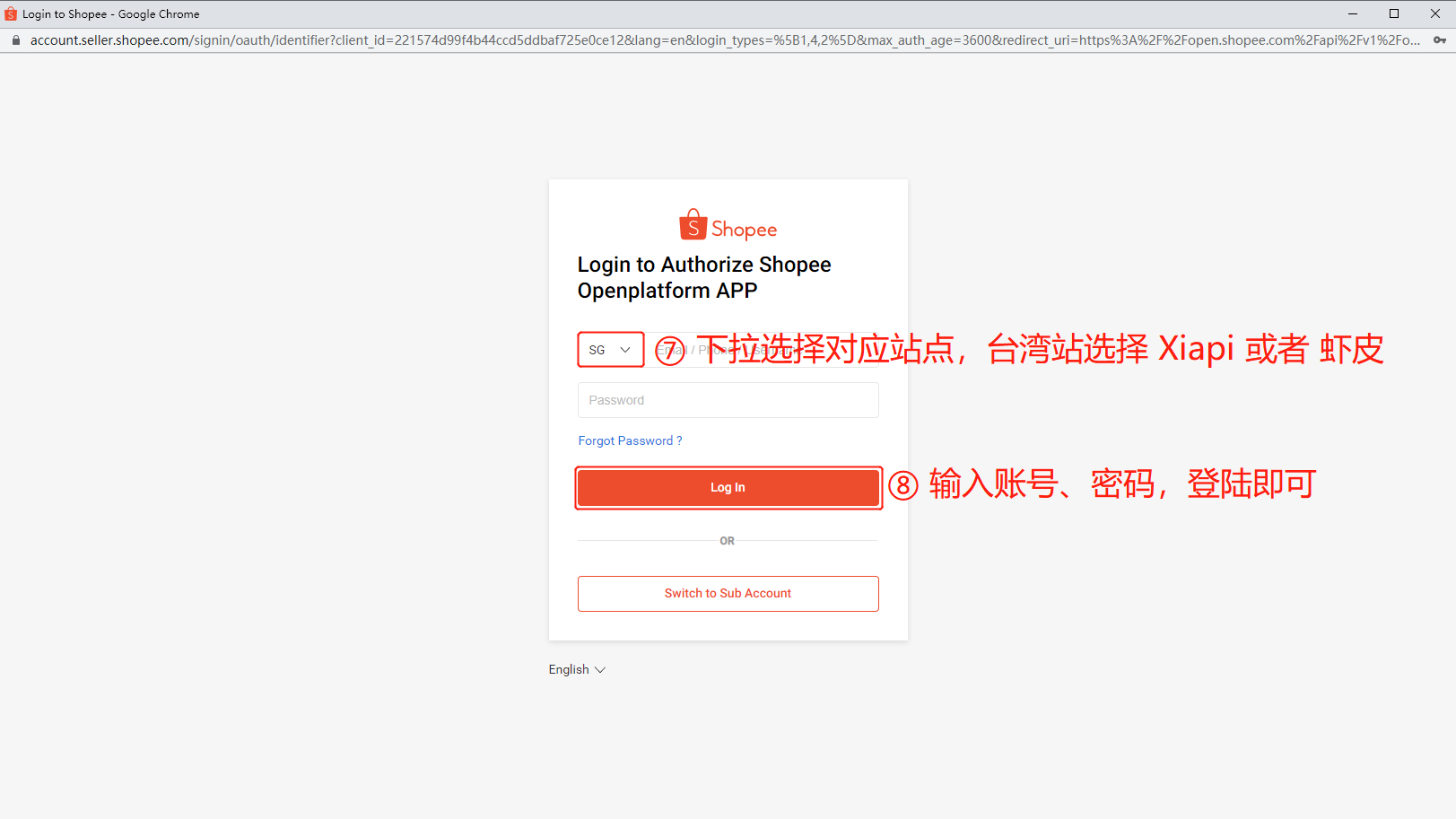 注意:如果您当前已经有登录Shopee后台,页面会直接显示您的Shopee账号,不要直接点击登录完成授权