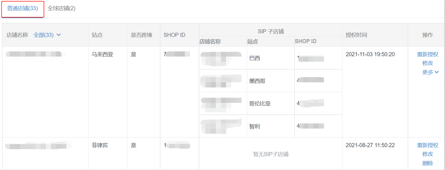 授权成功,小秘页面显示如图(可查看是否为跨境店铺、SHOP ID、SIP店铺情况)