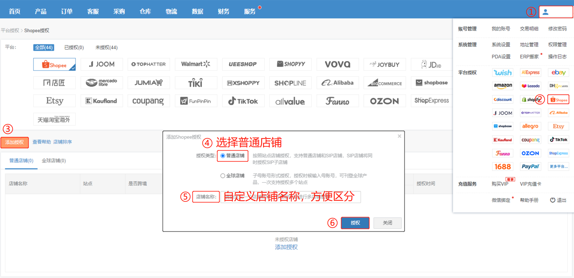 第一步:【登录店小秘主账号—用户名—平台授权—点击“Shopee”—点击添加授权—选择“普通店铺”—自定义店铺名称—授权】