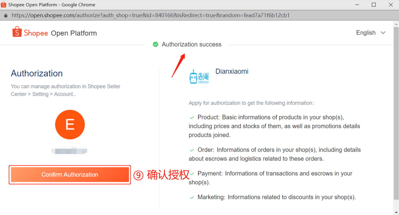 第三步:【点击确认授权,提示 Authorization success ,跳转小秘页面】