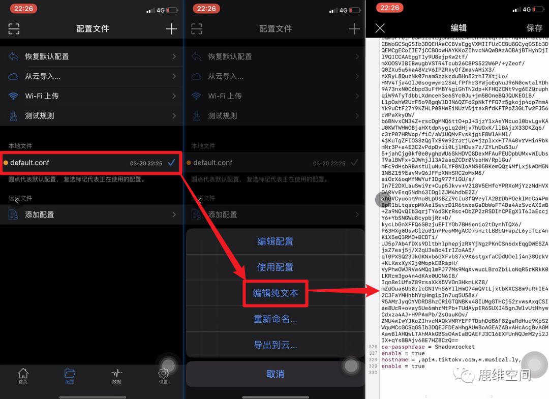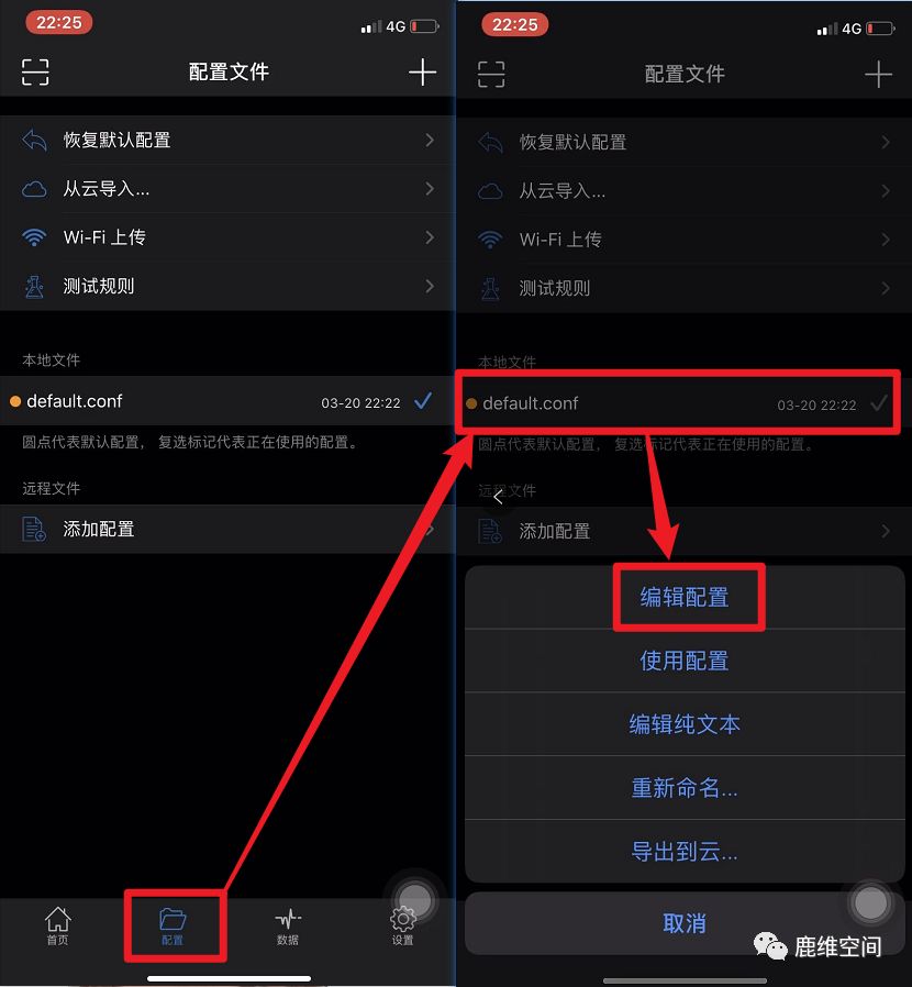 1、打开小火箭,点击配置–》点击配置文件(这里默认是default.conf,如果各位小伙伴自己有配置的其他文件也是一样的)–》点击编辑配置。