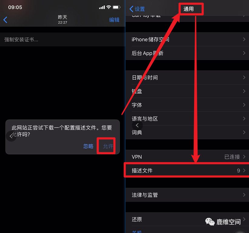4、点击允许–》然后打开手机设置—》通用—》描述文件