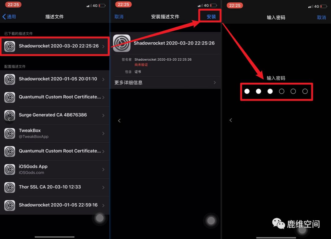 5、点击描述文件—》安装—》输入手机锁屏密码
