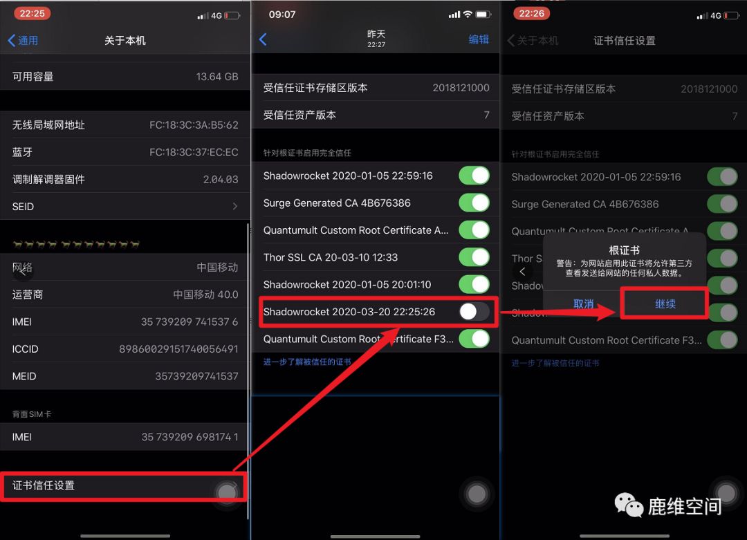 7、证书信任设置–》打开开关—》点击继续