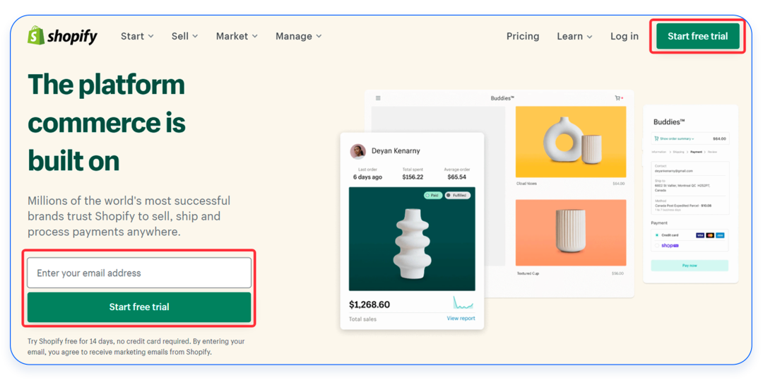 直接输入http://shopify.com 网址就会看到如下页面,点击右上方的【Start free trial】或者直接在下方输入邮箱然后点击下方的【Start free trial】。