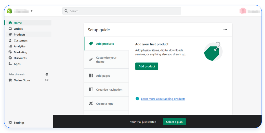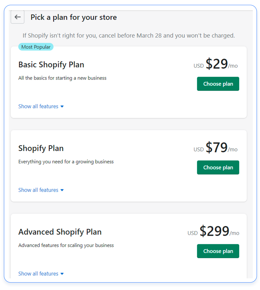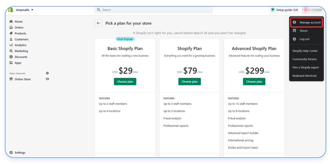 完成Shopify注册之后,新店铺有14天的免费试用期,在此期间可以设置站内的基础信息,当免费试用到期之后,卖家就要选择一个店铺套餐才可以继续运营店铺。Shopify店铺套餐有3个类型,月租费用是不同的,套餐费用越高,功能也会越多。