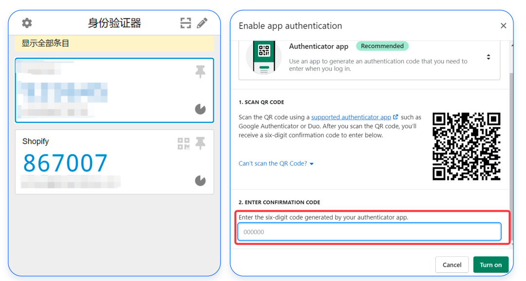 以上设置完成后,若有新的浏览器或者设备登录店铺,除了输入账号密码外,还需输入身份验证器里的动态六位验证码,便可安全的登录店铺。