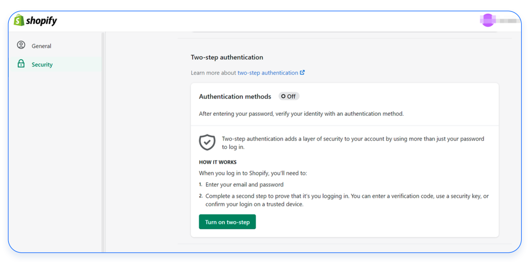 Shopify 独立站对卖家来讲是一个重要的资产,建议启用二次验证功能为店铺再加一把安全锁。两步身份验证(也称为双因素身份验证)提供更安全的登录过程,因为当您(或任何人)尝试登录时,都必须提供以下信息:(1)账户密码,(2)由移动应用或SMS文本消息生成的一次性授权代码。那么如何启用店铺的两步身份验证呢?步骤如下:
