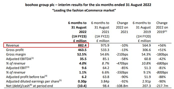 值得一提的是,根据Boohoo此前公布的2022年中期财报,今年上半年,Boohoo营收从9.759亿英镑同比下降10%至8.824亿英镑;在英国市场,营收从5.696亿英镑下降4.4%至5.446亿英镑;