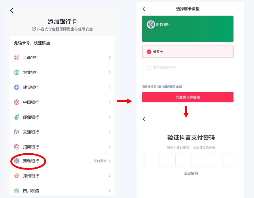 3.选择“新韩银hang”->同意协议->输入抖音支付密码进行验证。