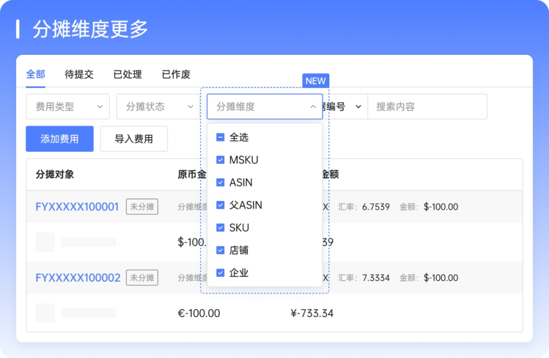 第二,费用管理新增父ASIN、SKU、多店铺和全店铺分摊维度,系统自动分摊涉及企业维度、多店铺维度的费用,无需手动分摊费用到单个店铺;费用管理支持以单据维度状态维度展示,即“全部”、“待提交”、“已处理”、“已作废”;