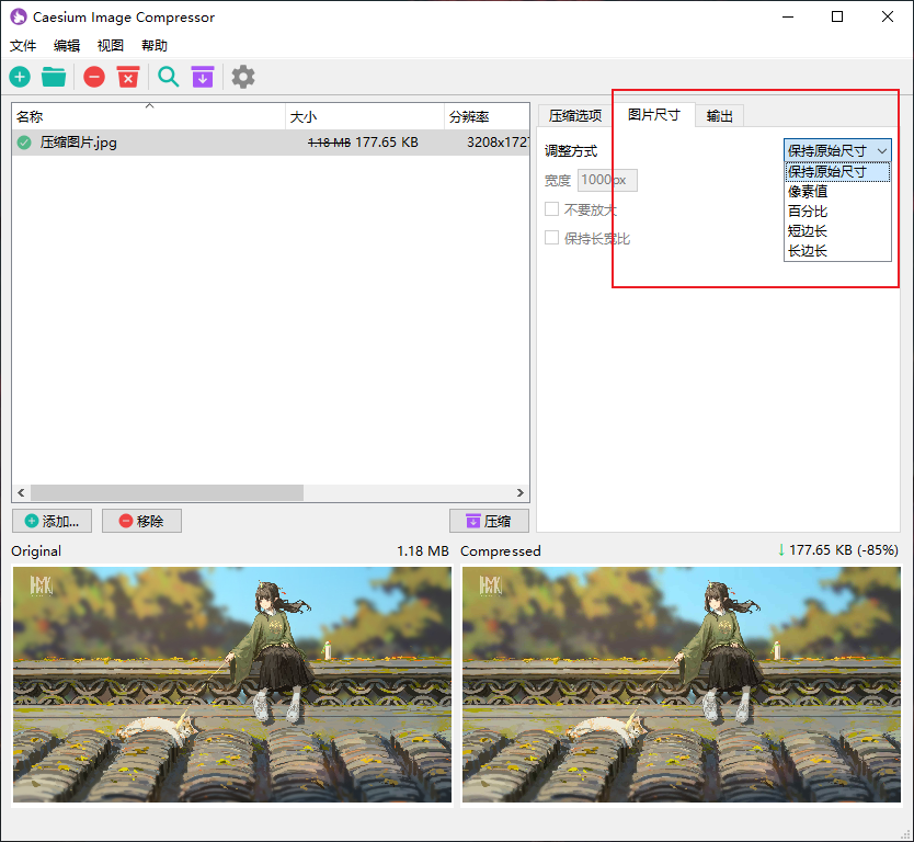 软件还支持调节图片尺寸,可选择保持原始尺寸,像素值,百分比等等,如图所示:
